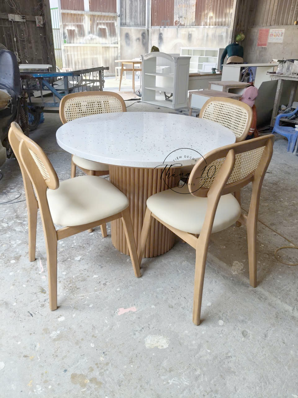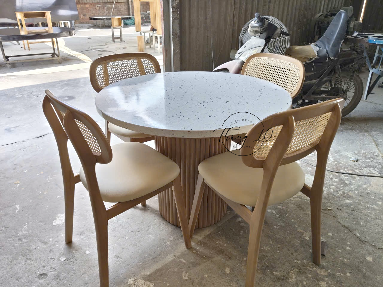 Bàn Ăn Tròn, Mặt Đá Terrazzo & 4 Ghế Mây Cao Cấp – Liên Hệ Trước Khi Đặt Hàng Không Có Sẵn